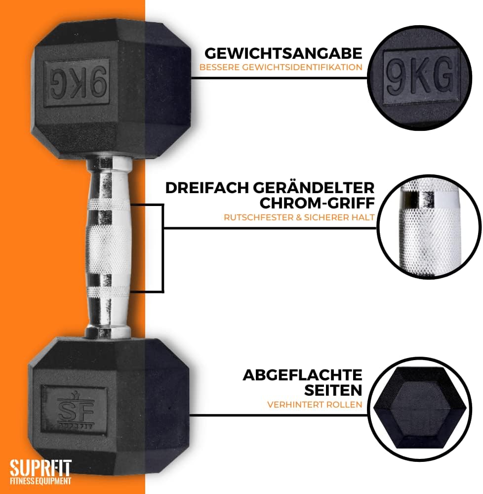 Erleben Sie erstklassiges Krafttraining mit diesen SUPRFIT Hexagon Kurzhanteln. Das Paar Hanteln verfügt über einen gummierten Eisenkern und einen rutschfesten Chromgriff. Ideal für Calisthenics, Krafttraining und Crossfit. Die Hanteln sind in Gewichten von 1-50 kg erhältlich.